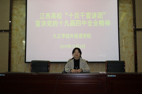 12月4日下午,学习党的十九届四中全会精神宣讲会在外国语学院三楼报告厅举行。学校宣讲团成员、马克思主义学院邱洁瑞教授作宣讲报告。外国语学院党委班子以及全体教师聆听了宣讲会。