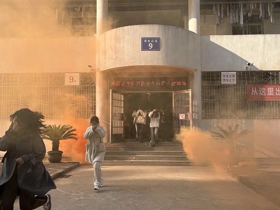 演练前期,学院结合开学第一课安全教育周部署的工作要求,周密安排演练流程,明确疏散路线、集合点位及各环节责任分工,提前向学生普及消防应急疏散注意事项,确保演练有序高效。模拟演练正式启动,九栋宿舍楼内烟雾弥漫,住宿学生在工作人员引导下,迅速捂住口鼻、弯腰低姿,沿预定路线快速有序撤离至安全集合区域,全程无拥挤、慌乱现象。疏散结束后,曾文黔、黄振华两位老师围绕校园宿舍火灾高发场景,开展专题培训,讲解火灾常见诱因、初期扑救及疏散技巧,并现场演示消防栓、灭火器的正确使用方法,拆解操作口诀、明确关键要点,手把手指导学生实操体验,及时纠正不规范动作,并对消防报警电话的要点进行了详细讲解。